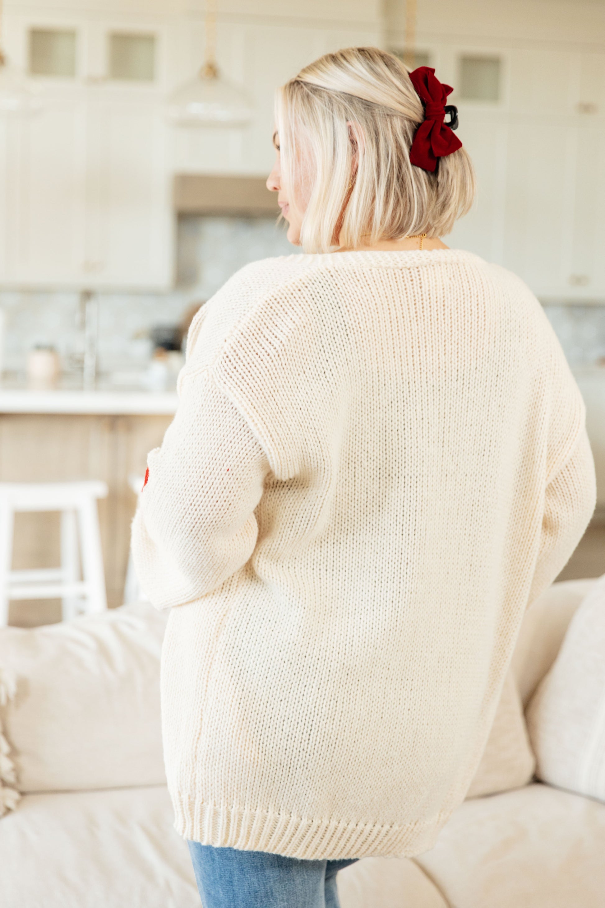 Fall in love with the Heart Eyes Cardigan! This mid-weight sweater knit envelopes you in a longline fit, while the knit red hearts add a pop of color. With an open front, this cardigan is perfect for layering and keeping you cozy. (You'll heart this addition to your wardrobe!)