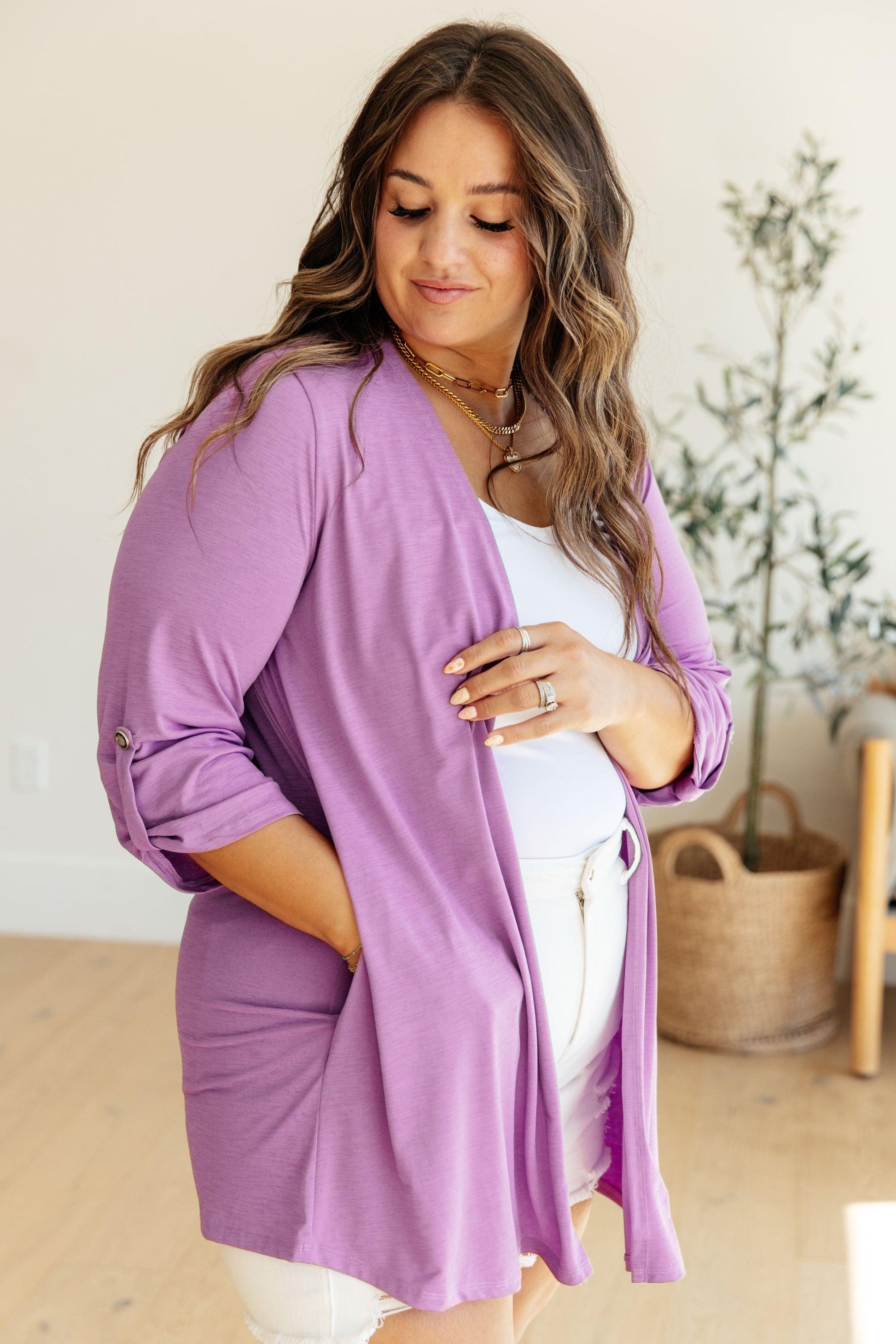 Introducing the Lizzy Cardigan in Regalia, the perfect blend of style and comfort. Stay cool with the Bulagri fabric and enjoy wrinkle-resistant and lightweight properties. Featuring faux button tab 3/4 sleeves, an open front, and a pleated back for a unique look. With functional pockets and a comfortable fit, this cardigan is a must-have. Order now for a fresh and playful look (and cozy comfort)!