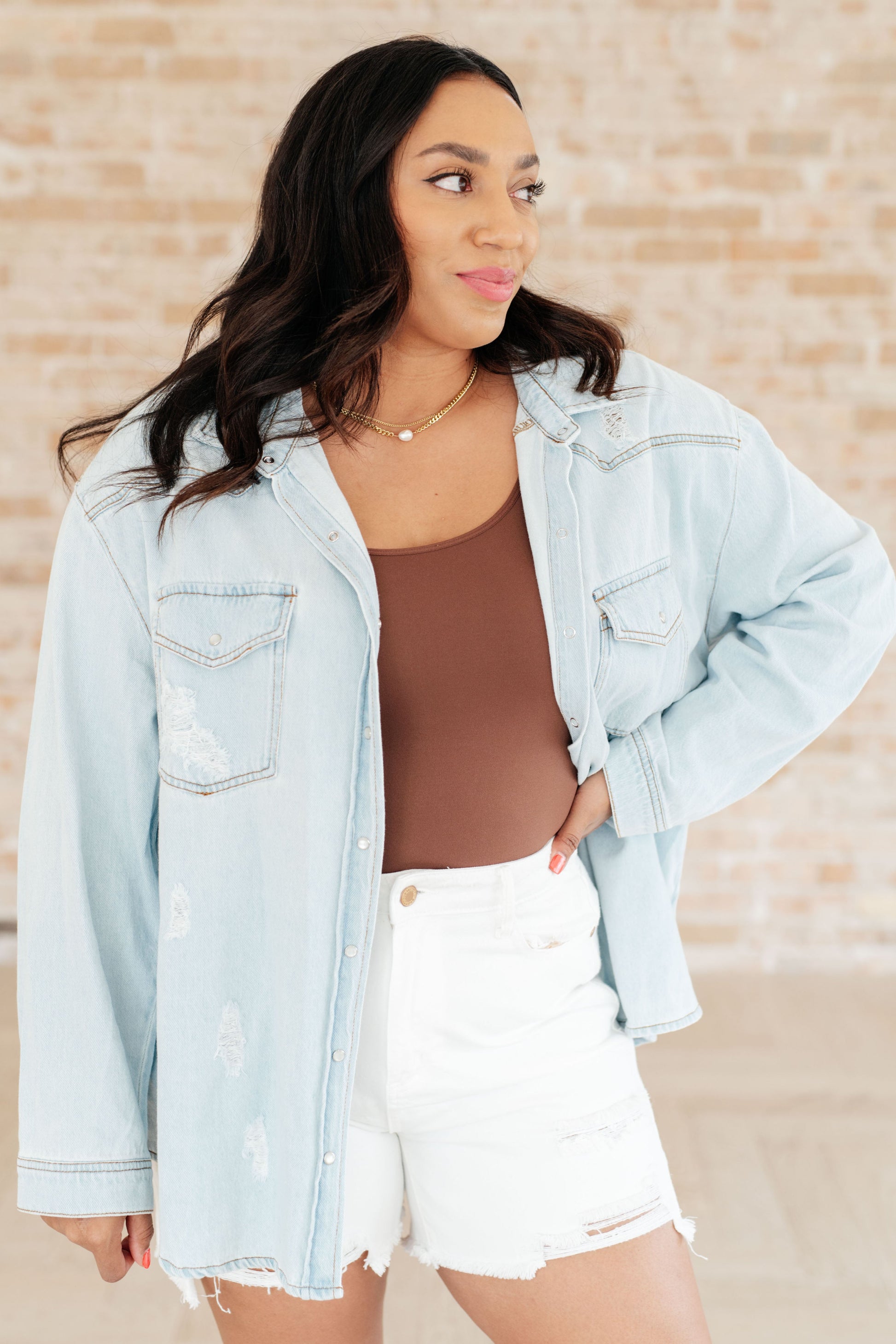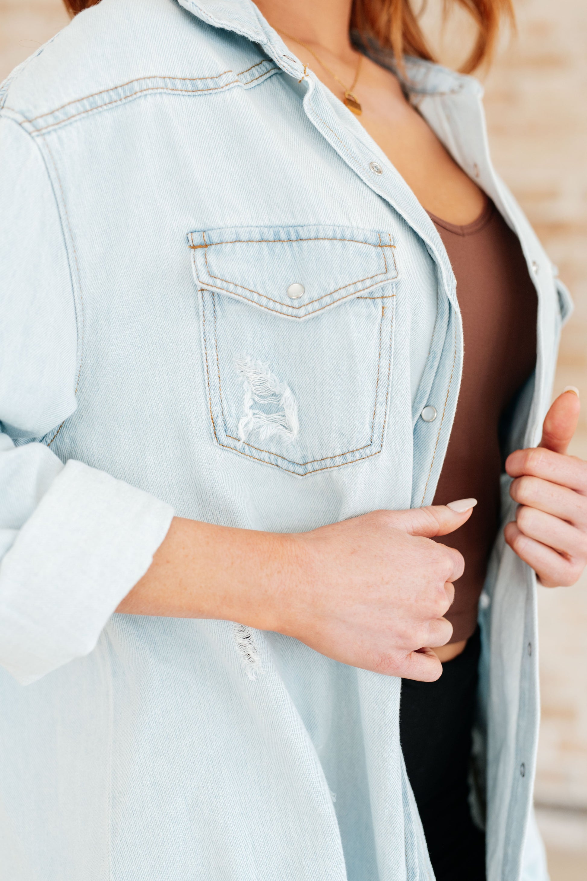 You hear that? That's the "oohs" and "ahhs" from My Walkman Denim Shacket. Crafted with lightweight denim and featuring a collared neckline, this shacket adds a touch of edge to any outfit. The faux pearl snap closures, front patch pockets, and distressed detailing add unique touches, while the banded sleeve cuffs and scooped hem provide a comfortable and flattering fit. Upgrade your wardrobe with this versatile and stylish piece.