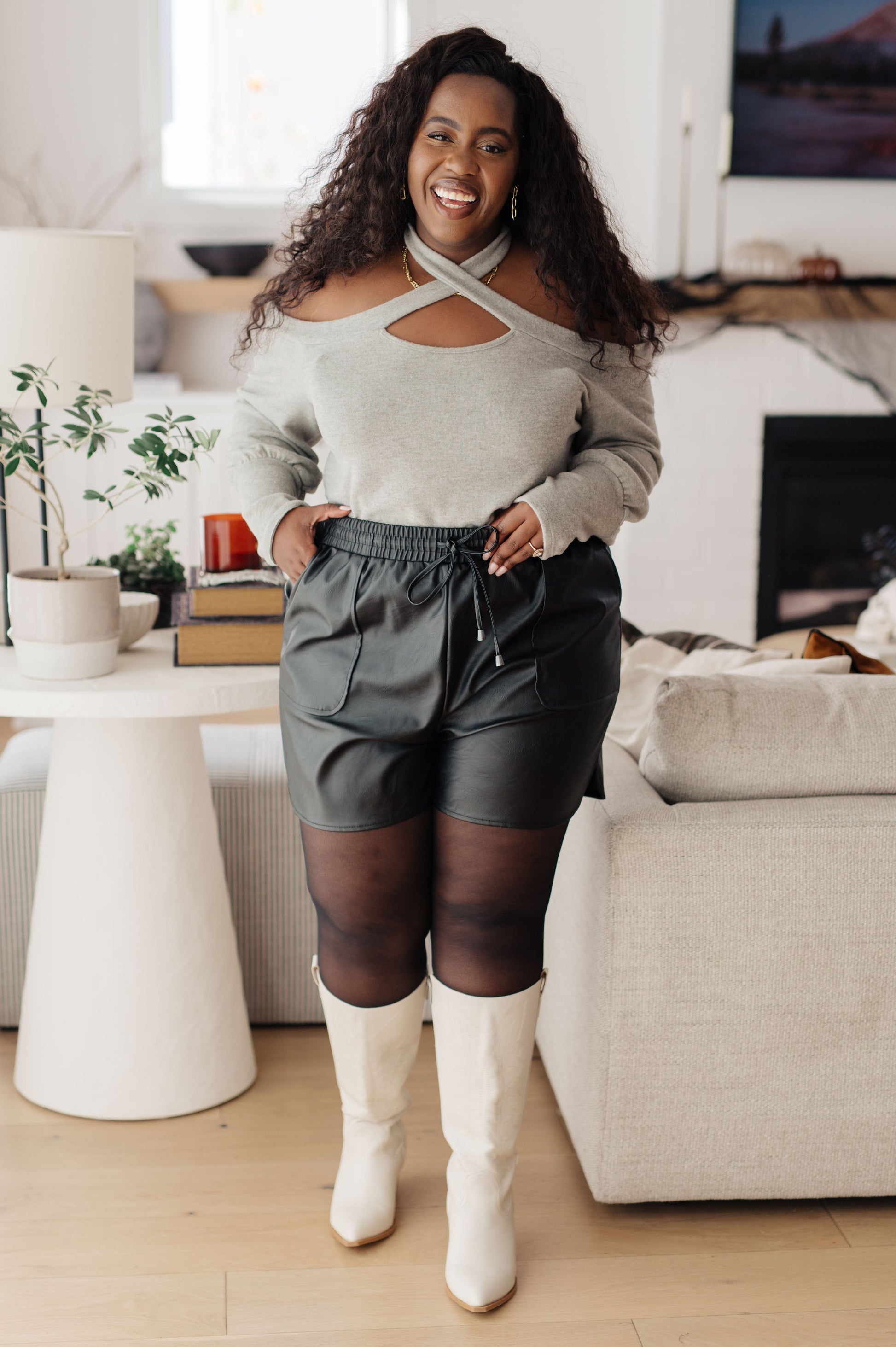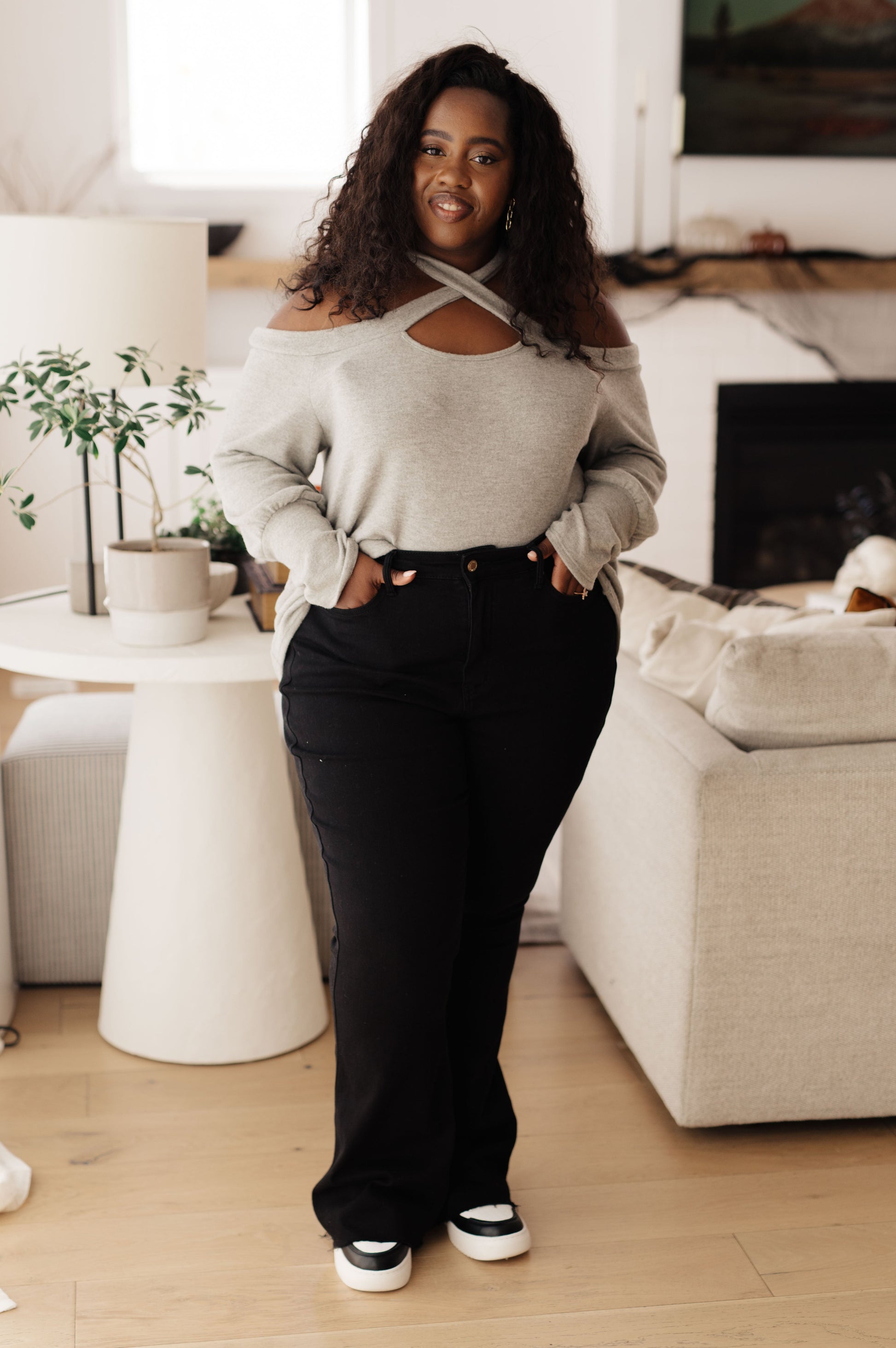 This Pizza and a Movie Halter Detail Top is the perfect date night look. Its brushed knit material is super comfy while the crossover keyhole halter neckline creates an ultra-chic vibe. Get ready for a night out!