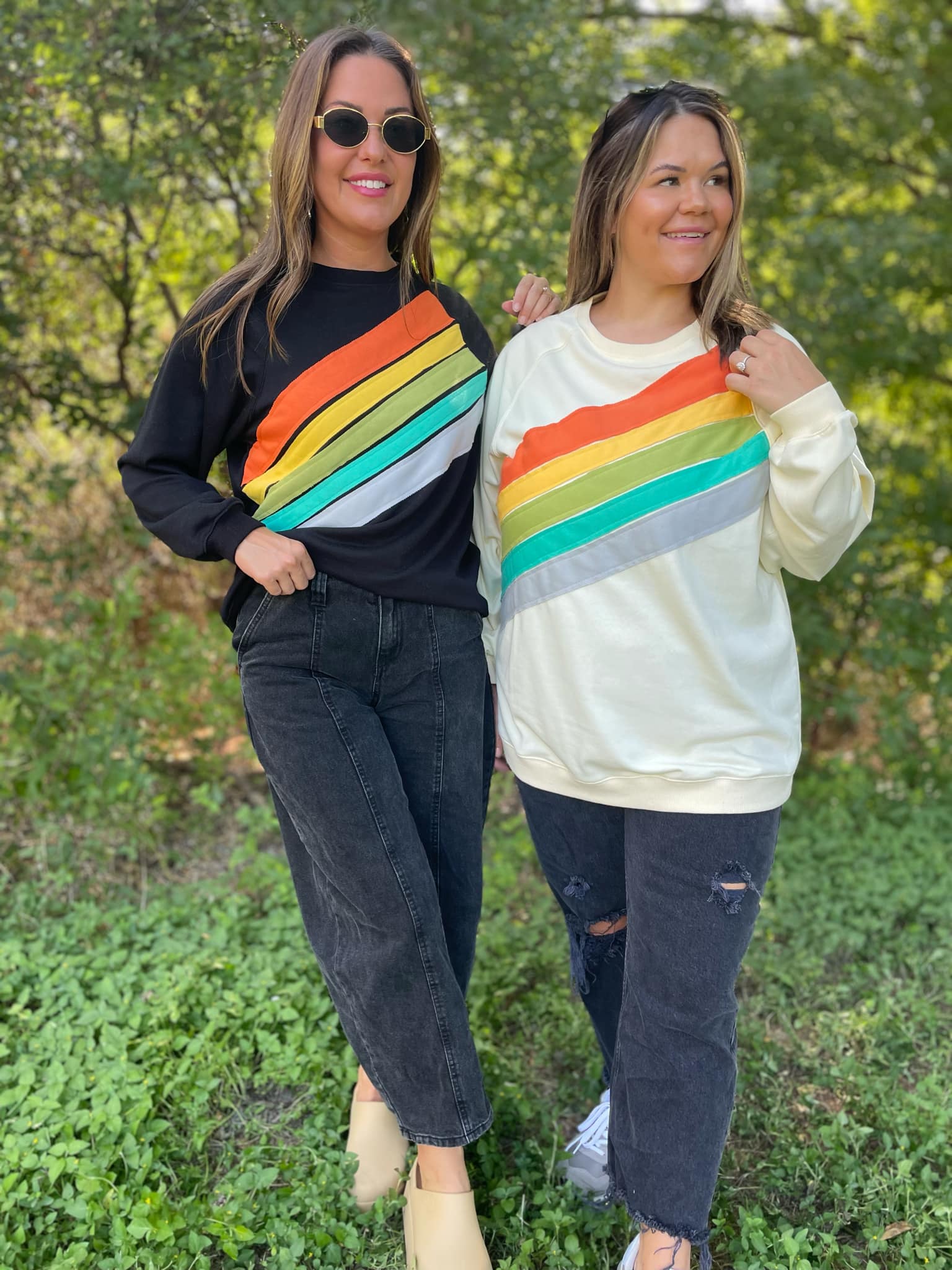 This rainbow pullover is giving us all the retro feels! We love the raw edge detailing of the stripe details, and the colors really pop on both the black and cream options. It's a medium weight french terry so will transition well between seasons.