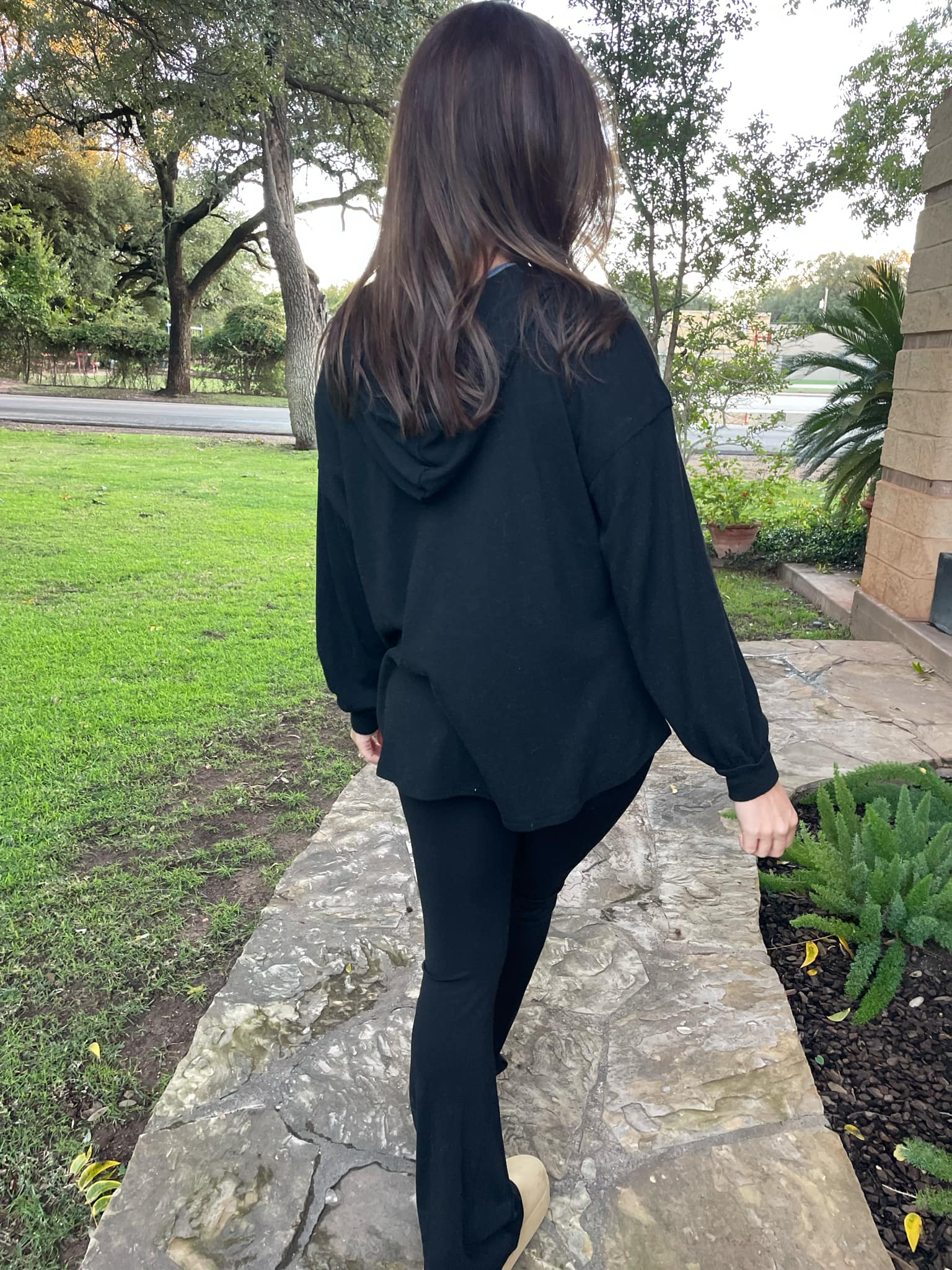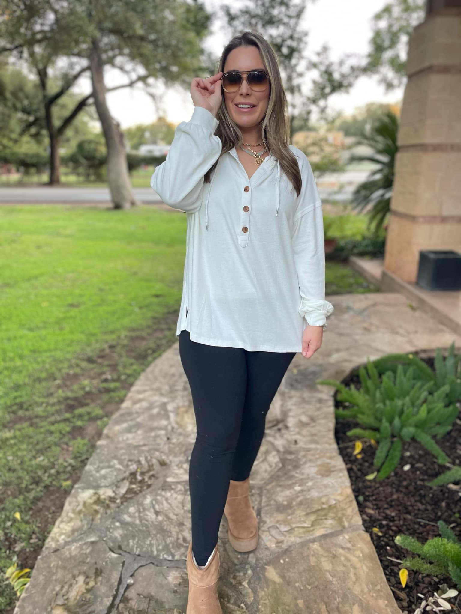 This lightweight pullover is soft and comfy! Featuring a drawstring hood, tortoise shell buttons and side slits. Available in four colors!