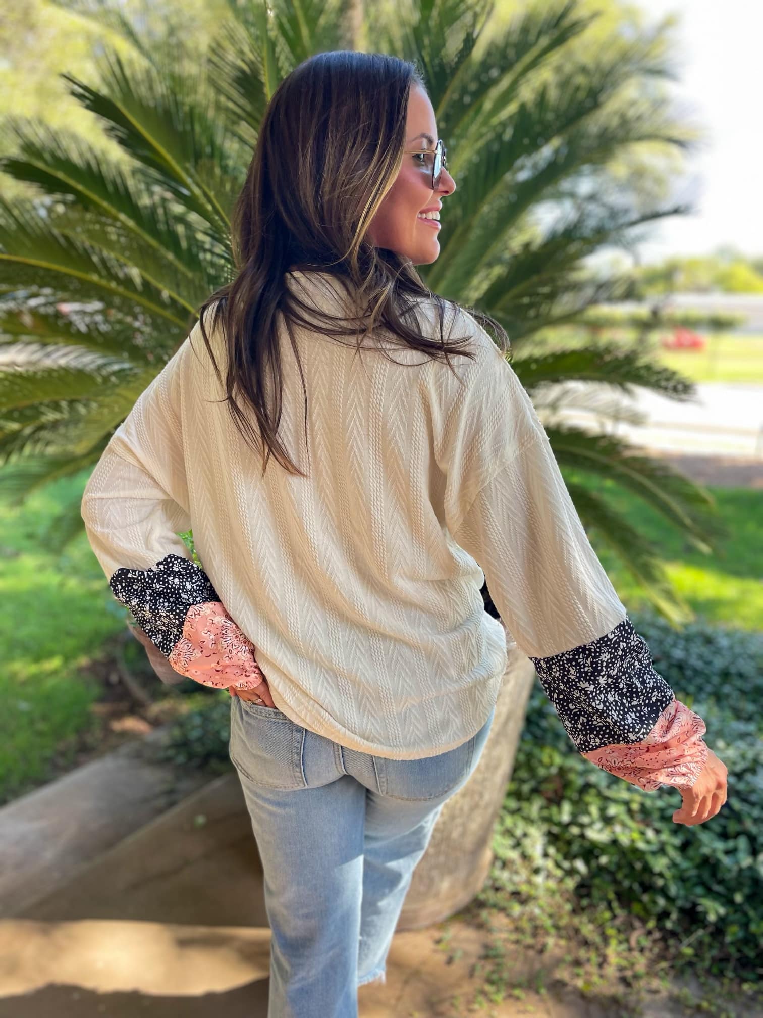 This relaxed fit blouse has a beautiful combination of textures, fabrics and prints. Available in pink, black and cream with pink and black floral accent fabrics on the sleeves.