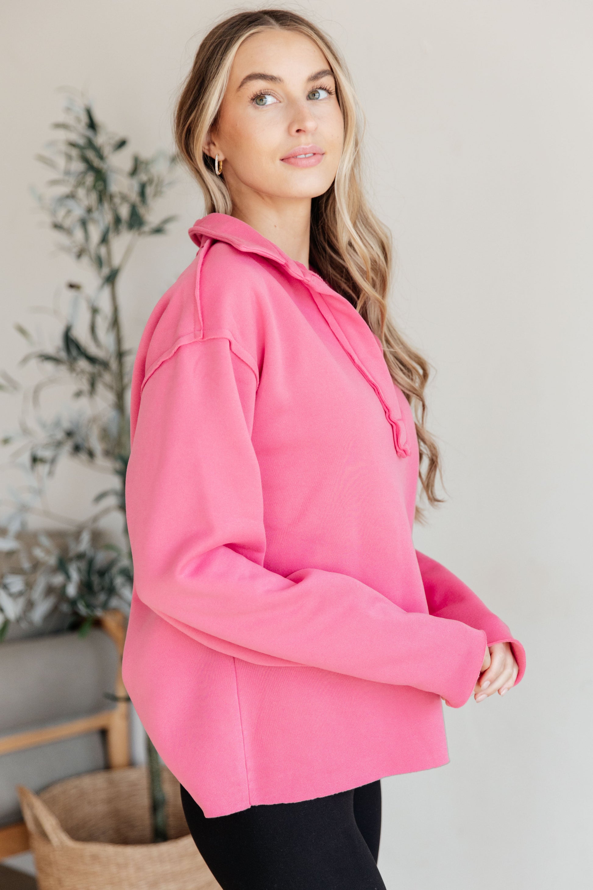 Nail that cozy, cool look with the Same Ol' Situation Collared Pullover in Hot Pink. With fleece lining, light stretch, and an oversized fit, you'll stay warm and comfy while rocking the v-neck, drop shoulder, exposed seams, and raw hem. Stand out in any situation!